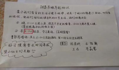 我们学院想到这种做法的起因是2014级软件工程专业有一个宿舍的几个学生,因为大家制定了共同的约定,例如早上6:30起床一起学英语,23:00必须熄灯等等,并且为之坚持了四年。