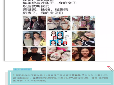在校期间同宿舍的几名学生,在学业、生活、参加竞赛、参与项目等方面表现都很优秀,并且在2018年毕业时,全部签约京东、腾讯等优质企业,就业情况非常好。软件工程卓越班学生萧海霞九月份收到了极盛科技、金山wps、链家、京东等offer,最后签约京东;徐欢签约58同城;张雪签约腾讯。