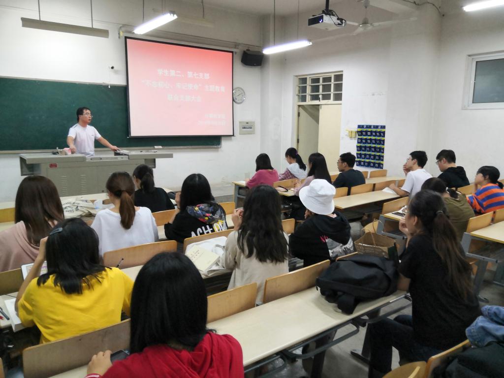 9月26日晚8:00,必赢bwin学生第二、第七党支部在教3-209联合开展“不忘初心、牢记使命”主题教育,活动由第党七支部书记董元浩同志主持。