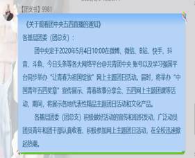2020年5月4日,我院学生积极参与,在微博、微信、B站、快手、抖音、斗鱼、今日头条等各大网络平台@共青团中央账号以及学习强国平台,参加了这次网上主题团日活动。