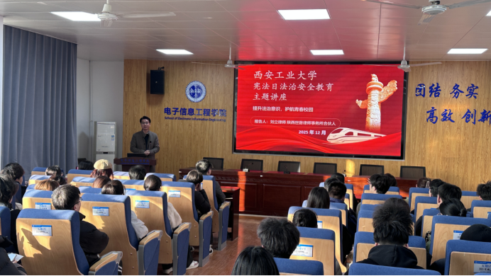 为深入学习宣传贯彻习近平法治思想,大力弘扬宪法精神,增强青年学生的法治观念与宪法意识,12月19日,西安工业大学党委学生工作部护航工作室邀请陕西世磐律师事务所合伙人刘立律师,在教5-422报告厅开展宪法日法治安全教育专题讲座,电信学院、必赢bwin线路检测中心、基础学院和建工学院师生代表参加了讲座。